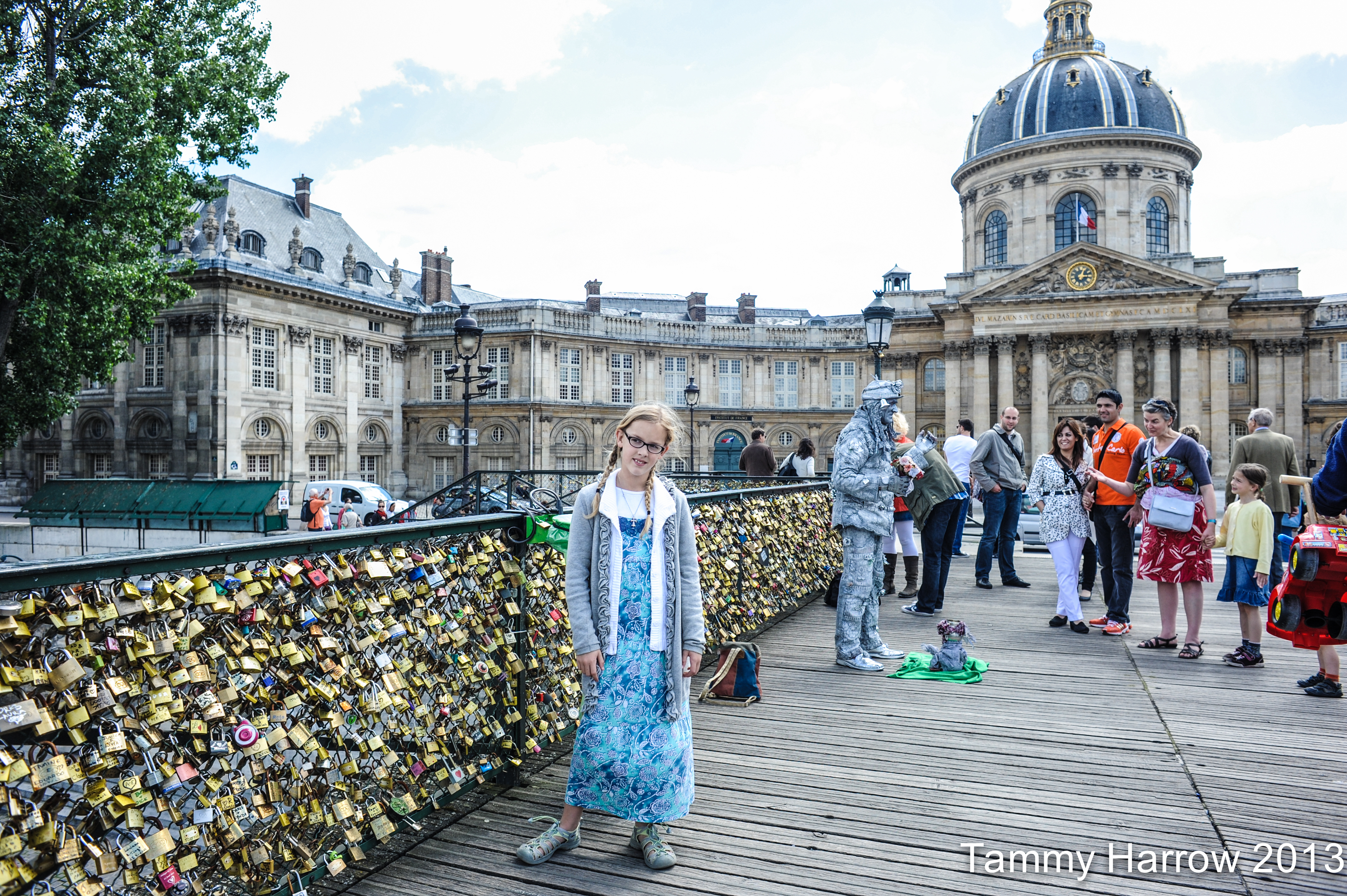 One of many “Love Lock” bridges- Legend has it if you write the name of both yourself and your lover, lock it on the bridge then toss the key over into the Seine, your love will last forever (or maybe just until the city cuts the lock off, not sure 🙂 In the background, behind the silver spray-painted man, stands the Institut de France.